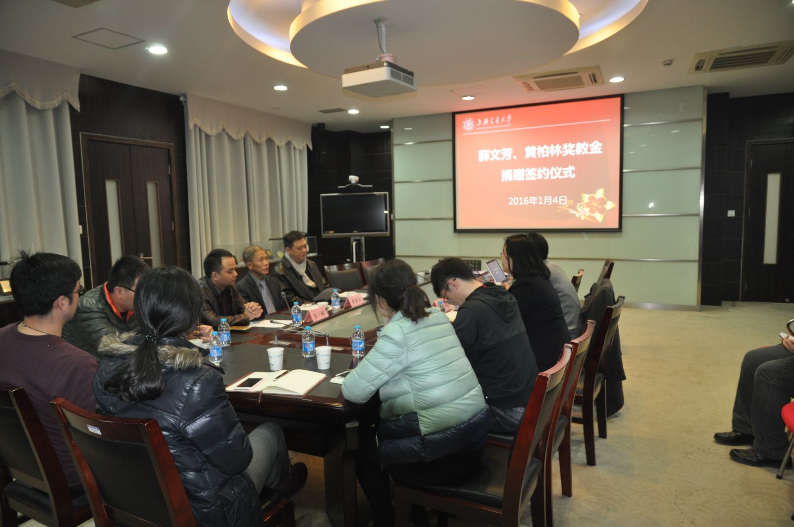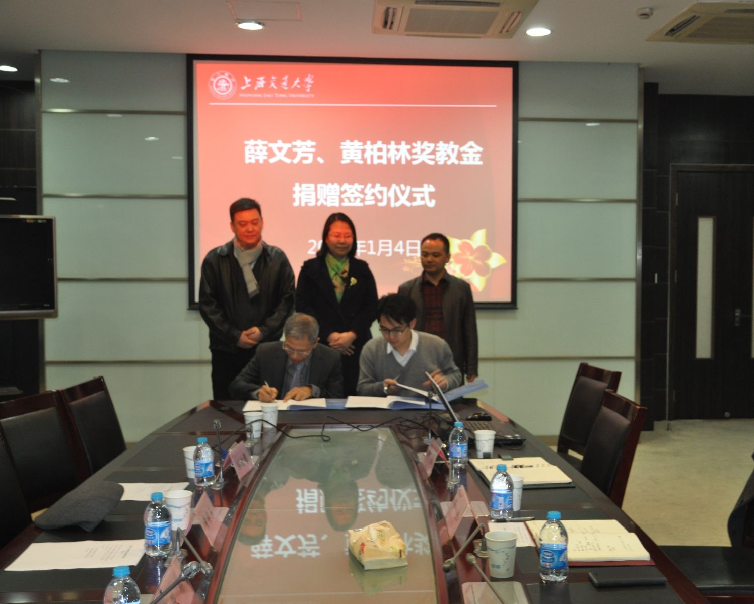 2016年1月4日下午,薛文芳、黄柏林奖教金捐赠签约仪式在太阳集团城网站2003举行。薛文芳、黄柏林基金捐赠人、台湾技高集团董事长黄铭玉先生,上海华商投资有限公司执行董事怀培勇先生,上海彬赟装饰工程有限公司总经理张斌先生,太阳集团城网站2003党委书记齐红及学院师生代表参加,仪式由太阳集团城网站2003党委副书记龚强主持。